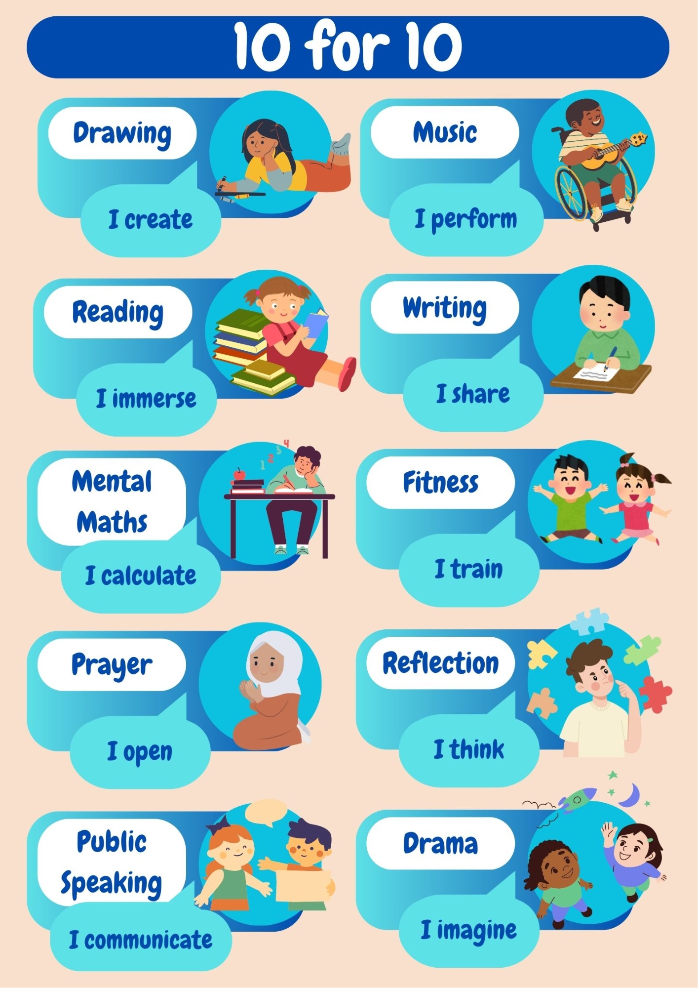 Every day we do 10 things for 10 minutes. We know if we practise those things for 10 minutes every day, we will get better and better! This gives everyone an opportunity to get really good at a whole range of skills. We learn a musical instrument, we run to stay fit, we write songs and stories and get fast at mental arithmetic. We draw and we read. 10 for 10 is built on oracy with daily time for reflection, speaking and drama. As a Christian school, we also offer time to pray - for all faiths.